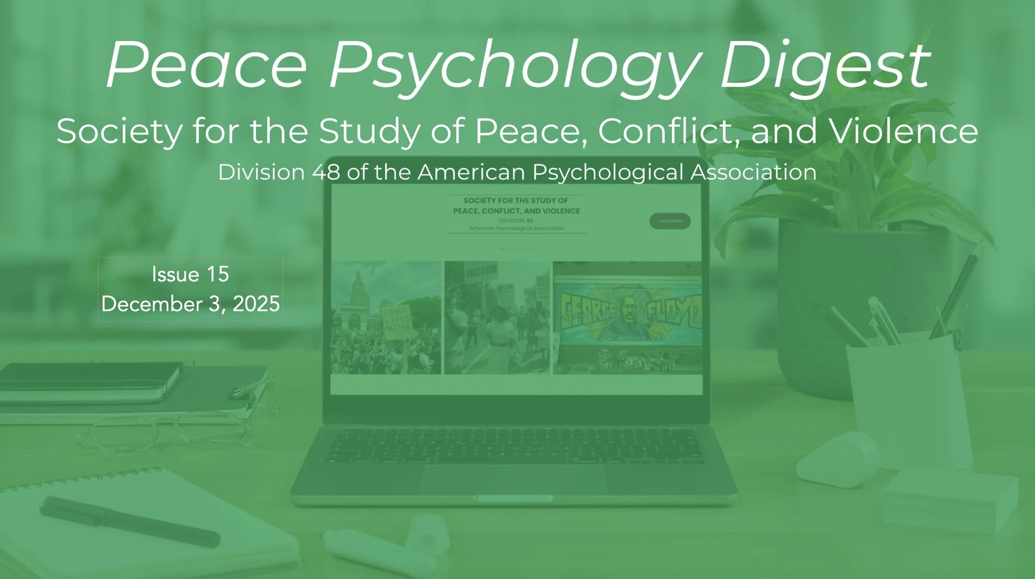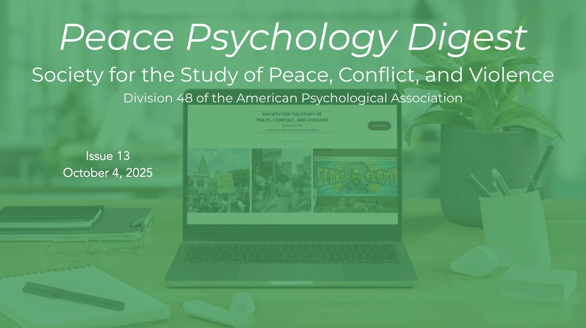 The Peace Psychology Digest is the newsletter of the Society for the Study of Peace, Conflict, and Violence (Division 48 of the American Psychological Association). Our goal is to inform you twice a month about our own activities and a diverse range of peace-related resources and opportunities around the world. We hope you find the digest valuable.